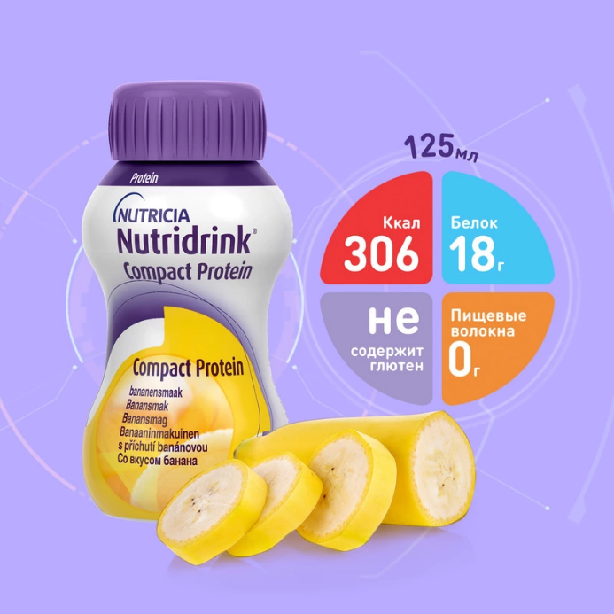 Одна бутылочка Nutridrink Compact Protein 125 мл содержит 18 г белка, 300/306 ккал, 13 витаминов и 15 минеральных веществ. 1-2 бутылочки Nutridrink Compact Protein могут помочь восполнить суточную потребность в белке и энергии.