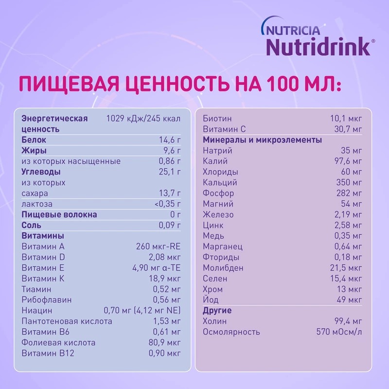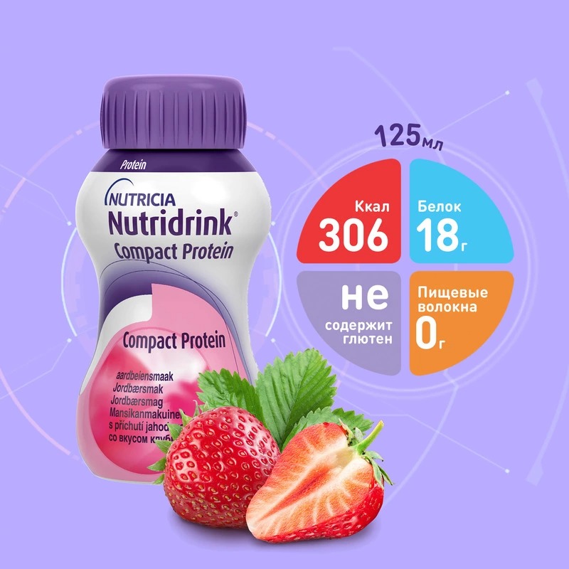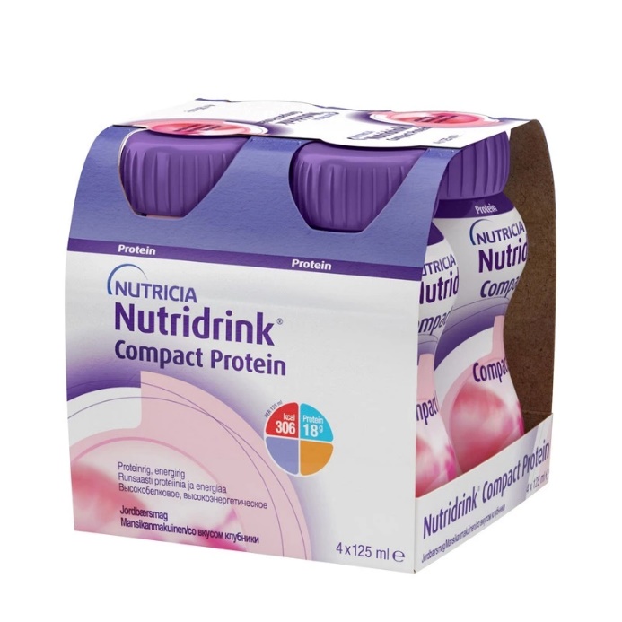 Одна бутылочка Nutridrink Compact Protein 125 мл содержит 18 г белка, 300/306 ккал, 13 витаминов и 15 минеральных веществ. 1-2 бутылочки Nutridrink Compact Protein могут помочь восполнить суточную потребность в белке и энергии.