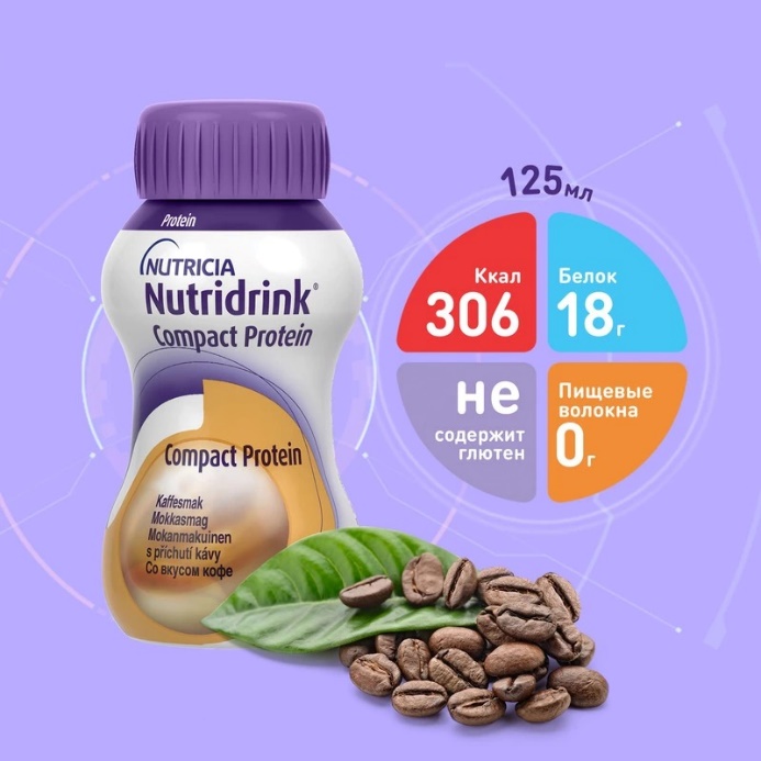 Одна бутылочка Nutridrink Compact Protein 125 мл содержит 18 г белка, 300/306 ккал, 13 витаминов и 15 минеральных веществ. 1-2 бутылочки Nutridrink Compact Protein могут помочь восполнить суточную потребность в белке и энергии.