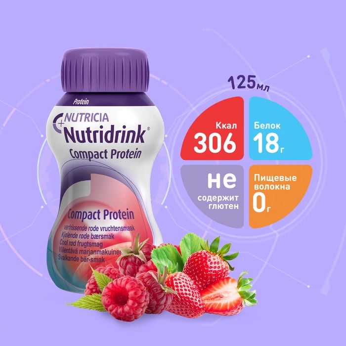Одна бутылочка Nutridrink Compact Protein 125 мл содержит 18 г белка, 300/306 ккал, 13 витаминов и 15 минеральных веществ. 1-2 бутылочки Nutridrink Compact Protein могут помочь восполнить суточную потребность в белке и энергии.