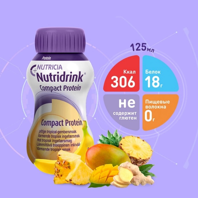 Одна бутылочка Nutridrink Compact Protein 125 мл содержит 18 г белка, 300/306 ккал, 13 витаминов и 15 минеральных веществ. 1-2 бутылочки Nutridrink Compact Protein могут помочь восполнить суточную потребность в белке и энергии.