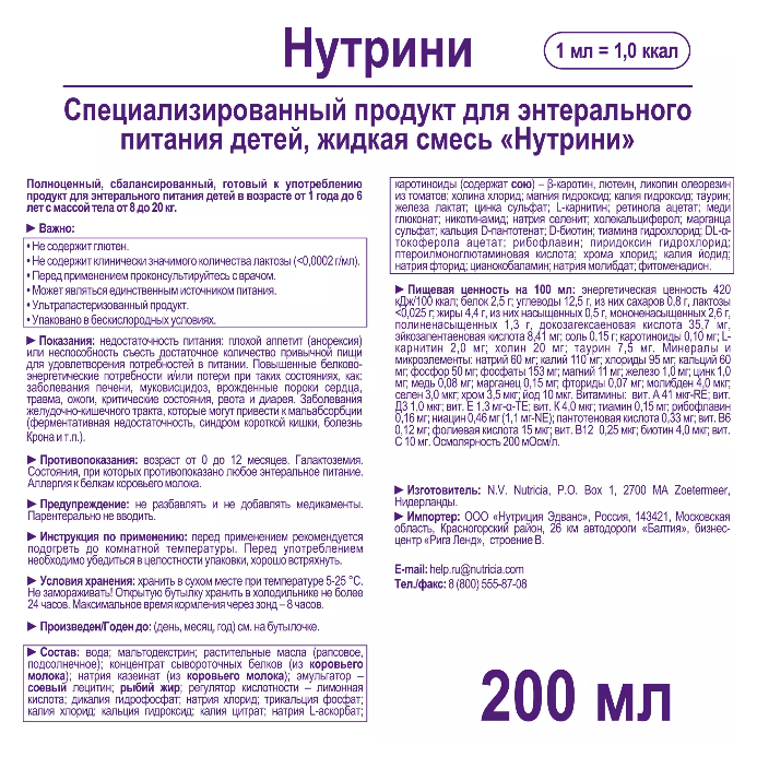 Может являться единственным источником питания для детей с 1 года до 6 лет или массой тела от 8 до 20 кг, либо дополнением к основному рациону