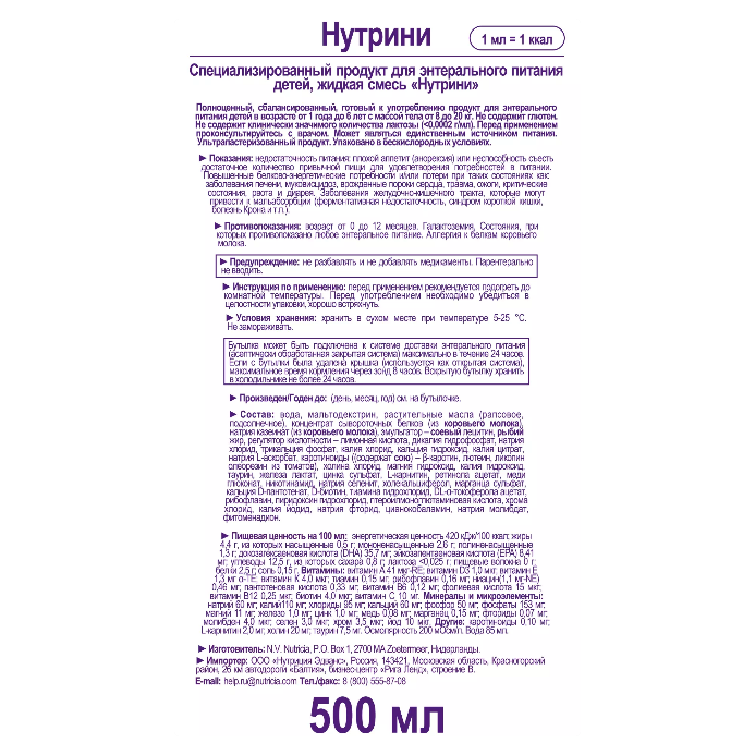 Нутрини, Нутрини с пищевыми волокнами, Нутрини Энергия в ламинированных самоспадающихся пакетах, 500 мл специально разработаны для зондового питания детей в возрасте от 1 года до 6 лет (или весом от 8 до 20 кг)в условиях стационара возрасте при следующих ситуациях: