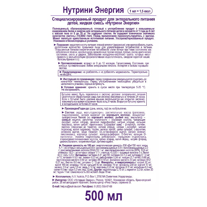 Нутрини, Нутрини с пищевыми волокнами, Нутрини Энергия в пластиковой бутылке, 500 мл специально разработаны для зондового питания детей в возрасте от 1 года до 6 лет (или весом от 8 до 20 кг)в условиях стационара возрасте при следующих ситуациях: