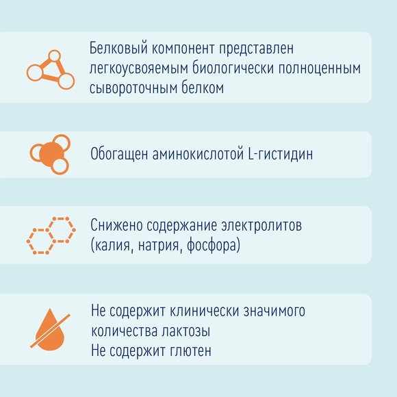 Специализированная полноценная смесь для диетического лечебное питания детей старше 3-х лет и взрослых с заболеваниями почек и почечной недостаточностью, в том числе получающих диализную терапию (гемодиализ, перитонеальный диализ). Содержит биологически ценный белок, обогащена L-гистидином.