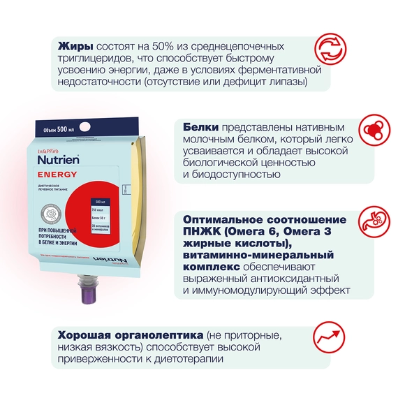 В отличие от «зондового стола», приготовленного из обычных пищевых продуктов, Nutrien Energy значительно быстрее и легче усваивается организмом.