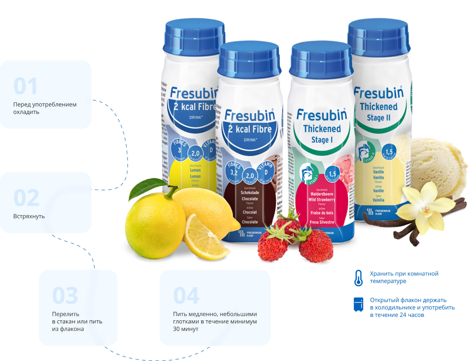 Полноценное специализированное питание с максимальным содержанием белка и калорий. Напиток способствует восстановлению запасов энергии, компенсирует катаболизм протеина, предупреждает потерю мышечной массы за счет высокого содержания калорий (400 ккал/200 мл) и белка (20 г/200 мл). Входящий в состав продукта витамин D в высокой дозировке (10 мкг/50 % от суточной потребности) укрепляет костную ткань, предупреждает трещины и переломы при падениях. Пищевые волокна нормализуют работу желудочно-кишечного тракта. Фрезубин содержит все необходимые организму витамины и микроэлементы. В составе нет глютена и лактозы.