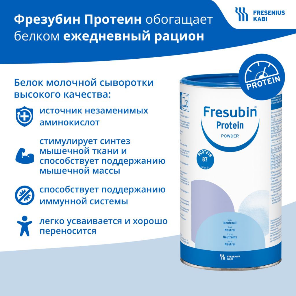 Сухая смесь для лечебного питания, представляет собой концентрированный источник сывороточного белка. Свободно смешивается с холодными или теплыми продуктами и жидкостями. Без содержания лактозы и глютена. Используется для перорального энтерального питания, для дополнительной дотации белка высокого качества, взрослым и детям с 3-х лет с целью поддержания массы мышц и увеличения безжировой массы тела. Способствует эффективному синтезу белка и обеспечивает его высокие потребности при различных состояниях.